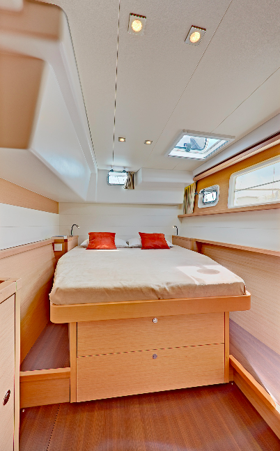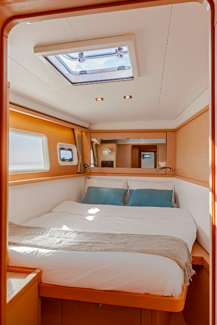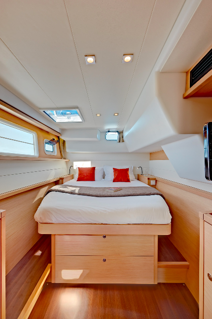 Dispone de cuatro camarotes y cuatro cuartos de baño completos con cabina de ducha independiente, la distribución de los camarotes en proas y popas dan una intimidad excepcional al encontrarse separados unos de otros. Con una vista panorámica desde cualquier zona del barco.