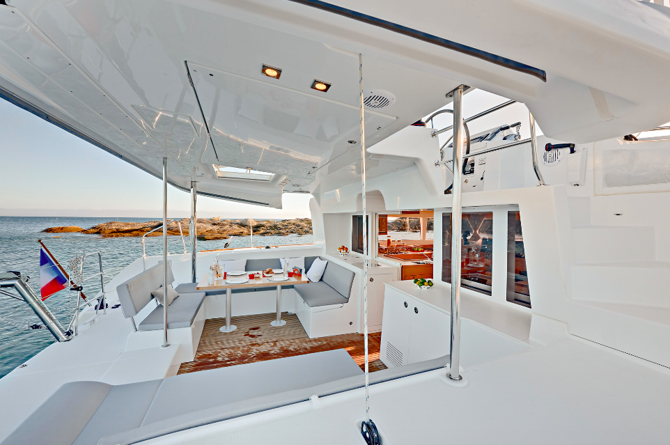 Consta de un gran salón, cocina y mesa de cartas, un sofá en forma de L y dos asientos movibles. La cocina muy espaciosa, con todos los electrodomésticos necesarios para tener buena vida a bordo. Puerta corredera de grandes dimensiones para salir al exterior donde está la zona más frecuentada, «la bañera» aquí puedes pasar buena parte del tiempo en tumbonas confortables, asientos, mesa para poder hacer las comidas, una zona protegida del sol y del viento.